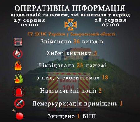 Підрозділами Головного управління ДСНС України у Закарпатській області впродовж чергової доби станом на 𝟳:𝟬𝟬 𝟐𝟖 серпня для проведення заходів з попередження надзвичайних ситуацій, оперативного реагування на події та ліквідації їх наслідків, гасіння пожеж, проведення інших рятувальних заходів здійснено 𝟑𝟔 виїздів, із яких 𝟑 – хибні.
