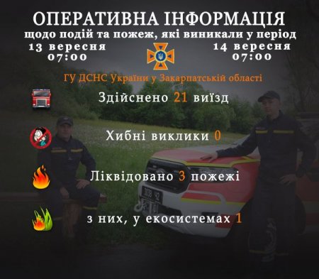 Підрозділами Головного управління ДСНС України у Закарпатській області впродовж чергової доби станом на 𝟳:𝟬𝟬 14 вересня для проведення заходів з попередження надзвичайних ситуацій, оперативного реагування на події та ліквідації їх наслідків, гасіння пожеж, проведення інших рятувальних заходів здійснено 21 виїзд. Хибних викликів не зафіксовано.