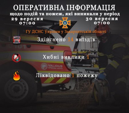 Підрозділами Головного управління ДСНС України у Закарпатській області впродовж чергової доби станом на 𝟳:𝟬𝟬 𝟑𝟎 вересня для проведення заходів з попередження надзвичайних ситуацій, оперативного реагування на події та ліквідації їх наслідків, гасіння пожеж, проведення інших рятувальних заходів здійснено 𝟏𝟒 виїздів, із них один – хибний виклик.