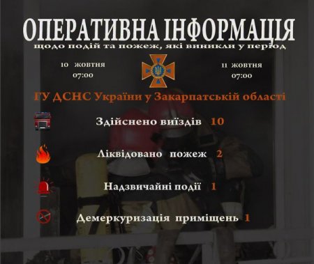 Підрозділами Головного управління ДСНС України у Закарпатській області впродовж чергової доби станом на 𝟳:𝟬𝟬 𝟏𝟏 жовтня для проведення заходів з попередження надзвичайних ситуацій, оперативного реагування на події та ліквідації їх наслідків, гасіння пожеж, проведення інших рятувальних заходів здійснено 𝟏𝟎 виїздів. Хибних викликів не зафіксовано.