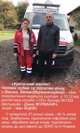 «Критичний виклик! Чоловік побив та 🔥підпалив жінку» - таке повідомлення надійшло сьогодні о 10.12 від диспетчера 📲служби «103» 🚑 бригаді №1302 (фельдшер - Діана ЖУЛКАНИЧ, водій – Іван ЯЦКІВ). За хвилину автівка 🚑 «швидкої» вже мчала на виклик у с.Вишка, що на Великоберезнянщині. Адреса 👩⚕️ фельдшерці була знайома - два тижні тому їй довелось звідси транспортувати до 🏥наркодиспансеру чоловіка, який поводив себе неадекватно… І ось тепер – підпал жінки.