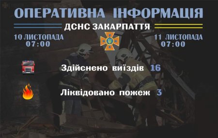 Підрозділами Головного управління ДСНС України у Закарпатській області впродовж чергової доби станом на 𝟳:𝟬𝟬 𝟭𝟭 листопада для проведення заходів з попередження надзвичайних ситуацій, оперативного реагування на події та ліквідації їх наслідків, гасіння пожеж, проведення інших рятувальних заходів здійснено 16 виїздів. Хибних викликів не зафіксовано.