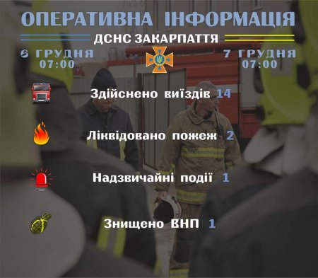 Підрозділами Головного управління ДСНС України у Закарпатській області впродовж чергової доби станом на 𝟳:𝟬𝟬 𝟳 грудня для проведення заходів з попередження надзвичайних ситуацій, оперативного реагування на події та ліквідації їх наслідків, гасіння пожеж, проведення інших рятувальних заходів здійснено 14 виїздів. Хибних викликів не зафіксовано.