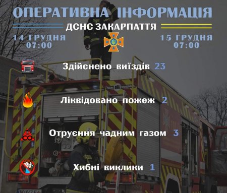 Підрозділами Головного управління ДСНС України у Закарпатській області впродовж чергової доби станом на 𝟳:𝟬𝟬 𝟭𝟱 грудня для проведення заходів з попередження надзвичайних ситуацій, оперативного реагування на події та ліквідації їх наслідків, гасіння пожеж, проведення інших рятувальних заходів здійснено 23 виїзди, з яких один – хибний.
