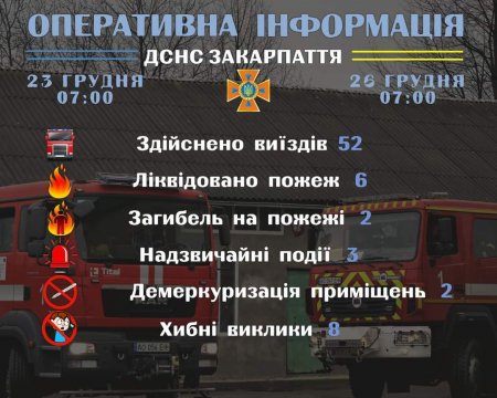 Підрозділами Головного управління ДСНС України у Закарпатській області впродовж 23-26 грудня станом на 𝟳:𝟬𝟬 𝟮𝟲 грудня для проведення заходів з попередження надзвичайних ситуацій, оперативного реагування на події та ліквідації їх наслідків, гасіння пожеж, проведення інших рятувальних заходів здійснено 52 виїзди, з яких вісім - хибні.