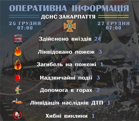 Підрозділами Головного управління ДСНС України у Закарпатській області впродовж чергової доби станом на 𝟳:𝟬𝟬 𝟐𝟕 грудня для проведення заходів з попередження надзвичайних ситуацій, оперативного реагування на події та ліквідації їх наслідків, гасіння пожеж, проведення інших рятувальних заходів здійснено 𝟐𝟒 виїзди, з яких один - хибний.