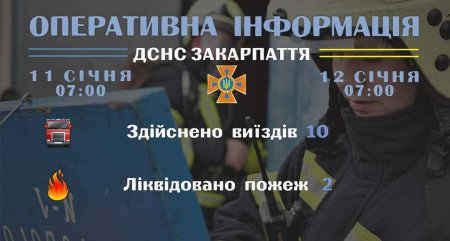 Підрозділами Головного управління ДСНС України у Закарпатській області впродовж чергової доби станом на 𝟳:𝟬𝟬 𝟏𝟐 січня для проведення заходів з попередження надзвичайних ситуацій, оперативного реагування на події та ліквідації їх наслідків, гасіння пожеж, проведення інших рятувальних заходів здійснено 𝟏𝟎 виїздів. Хибних викликів не зафіксовано.