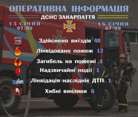 Підрозділами Головного управління ДСНС України у Закарпатській області впродовж 13-16 січня станом на 𝟳:𝟬𝟬 𝟭𝟲 січня для проведення заходів з попередження надзвичайних ситуацій, оперативного реагування на події та ліквідації їх наслідків, гасіння пожеж, проведення інших рятувальних заходів здійснено 𝟒𝟖 виїздів, з яких шість - хибні.