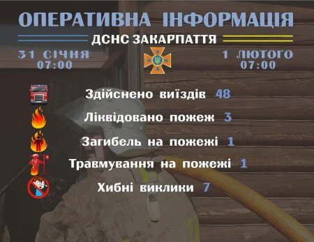 Підрозділами Головного управління ДСНС України у Закарпатській області впродовж впродовж чергової доби (станом на 𝟳:𝟬𝟬) 𝟭 лютого для проведення заходів з попередження надзвичайних ситуацій, оперативного реагування на події та ліквідації їх наслідків, гасіння пожеж, проведення інших рятувальних заходів здійснено 48 виїздів, з яких сім - хибні.