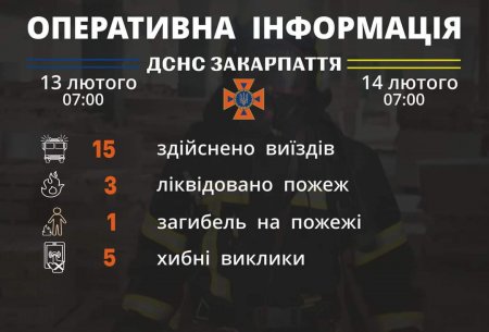 Підрозділами Головного управління ДСНС України у Закарпатській області впродовж чергової (станом на 𝟳:𝟬𝟬) 𝟏𝟒 лютого для проведення заходів з попередження надзвичайних ситуацій, оперативного реагування на події та ліквідації їх наслідків, гасіння пожеж, проведення інших рятувальних заходів здійснено 𝟏𝟓 виїздів, з яких п’ять – хибні.