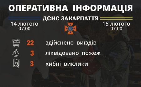 Підрозділами Головного управління ДСНС України у Закарпатській області впродовж чергової (станом на 𝟳:𝟬𝟬) 15 лютого для проведення заходів з попередження надзвичайних ситуацій, оперативного реагування на події та ліквідації їх наслідків, гасіння пожеж, проведення інших рятувальних заходів здійснено 22 виїзди, з яких три – хибні.