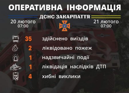 Підрозділами Головного управління ДСНС України у Закарпатській області впродовж чергової доби (станом на 𝟳:𝟬𝟬) 𝟐𝟏 лютого для проведення заходів з попередження надзвичайних ситуацій, оперативного реагування на події та ліквідації їх наслідків, гасіння пожеж, проведення інших рятувальних заходів здійснено 𝟑𝟓 виїздів, з яких 𝟒 – хибні.