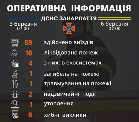 Підрозділами Головного управління ДСНС України у Закарпатській області впродовж 3-6 березня станом на 𝟳:𝟬𝟬 𝟲 березня для проведення заходів з попередження надзвичайних ситуацій, оперативного реагування на події та ліквідації їх наслідків, гасіння пожеж, проведення інших рятувальних заходів здійснено 𝟱𝟵 виїздів, з яких шість - хибні.