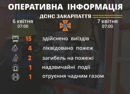 Підрозділами Головного управління ДСНС України у Закарпатській області впродовж чергової доби станом на 𝟳:𝟬𝟬 𝟳 квітня для проведення заходів з попередження надзвичайних ситуацій, оперативного реагування на події та ліквідації їх наслідків, гасіння пожеж, проведення інших рятувальних заходів здійснено 𝟭𝟱 виїздів. Хибних викликів не зафіксовано.
