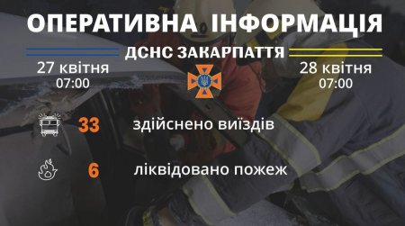 Підрозділами Головного управління ДСНС України у Закарпатській області впродовж чергової доби станом на 𝟳:𝟬𝟬 𝟮𝟴 квітня для проведення заходів з попередження надзвичайних ситуацій, оперативного реагування на події та ліквідації їх наслідків, гасіння пожеж, проведення інших рятувальних заходів здійснено 𝟯𝟯 виїзди. Хибних викликів не зафіксовано.