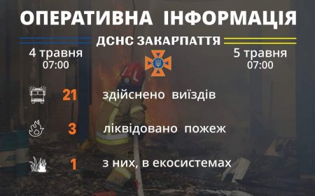 Підрозділами Головного управління ДСНС України у Закарпатській області впродовж чергової доби станом на 𝟳:𝟬𝟬 𝟱 травня для проведення заходів з попередження надзвичайних ситуацій, оперативного реагування на події та ліквідації їх наслідків, гасіння пожеж, проведення інших рятувальних заходів здійснено 𝟮𝟭 виїзд. Хибних викликів не зафіксовано.