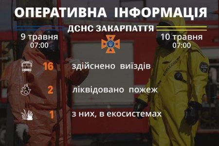 Підрозділами Головного управління ДСНС України у Закарпатській області впродовж чергової доби станом на 𝟳:𝟬𝟬 𝟭𝟬 травня для проведення заходів з попередження надзвичайних ситуацій, оперативного реагування на події та ліквідації їх наслідків, гасіння пожеж, проведення інших рятувальних заходів здійснено 𝟭𝟲 виїздів. Хибних викликів не зафіксовано.