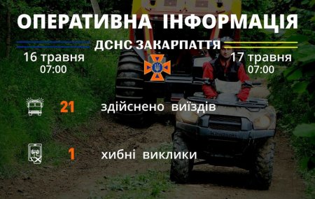 Підрозділами Головного управління ДСНС України у Закарпатській області впродовж чергової доби станом на 𝟳:𝟬𝟬 𝟭𝟳 травня для проведення заходів з попередження надзвичайних ситуацій, оперативного реагування на події та ліквідації їх наслідків, гасіння пожеж, проведення інших рятувальних заходів здійснено 𝟮𝟭 виїзд, з яких один - хибний.