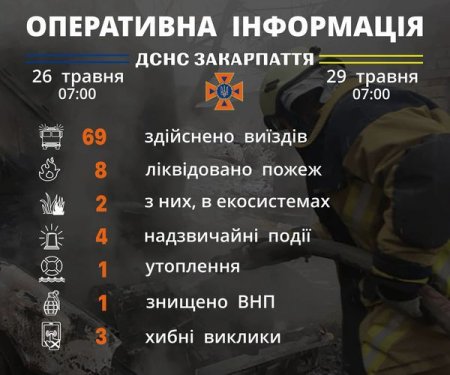 Підрозділами Головного управління ДСНС України у Закарпатській області впродовж 𝟮𝟲-𝟮𝟵 травня станом на 𝟳:𝟬𝟬 𝟮𝟵 травня для проведення заходів з попередження надзвичайних ситуацій, оперативного реагування на події та ліквідації їх наслідків, гасіння пожеж, проведення інших рятувальних заходів здійснено 𝟲𝟵 виїздів, з яких 𝟯 - хибні.