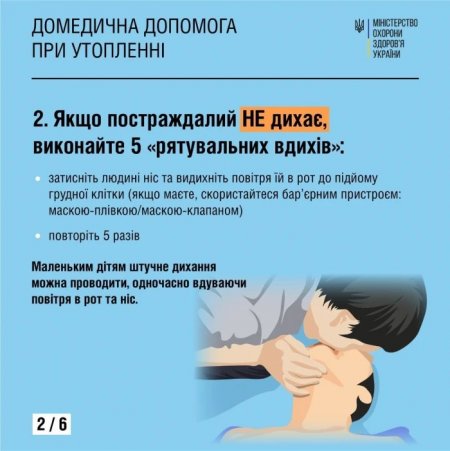 ✅ Якщо постраждалий не дихає, виконайте п'ять рятувальних вдихів;