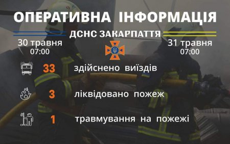 Підрозділами Головного управління ДСНС України у Закарпатській області впродовж чергової доби станом на 𝟳:𝟬𝟬 𝟯𝟭 травня для проведення заходів з попередження надзвичайних ситуацій, оперативного реагування на події та ліквідації їх наслідків, гасіння пожеж, проведення інших рятувальних заходів здійснено 𝟯𝟯 виїзди. Хибних викликів не зафіксовано.