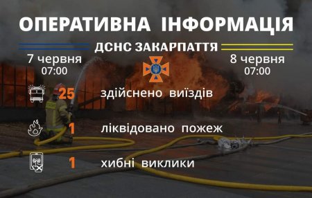 Підрозділами Головного управління ДСНС України у Закарпатській області впродовж чергової доби станом на 𝟳:𝟬𝟬 𝟴 червня для проведення заходів з попередження надзвичайних ситуацій, оперативного реагування на події та ліквідації їх наслідків, гасіння пожеж, проведення інших рятувальних заходів здійснено 𝟮𝟱 виїздів, з яких один - хибний.