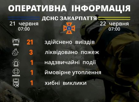 Підрозділами Головного управління ДСНС України у Закарпатській області впродовж чергової доби станом на 𝟳:𝟬𝟬 𝟐𝟐 червня для проведення заходів з попередження надзвичайних ситуацій, оперативного реагування на події та ліквідації їх наслідків, гасіння пожеж, проведення інших рятувальних заходів здійснено 𝟐𝟏 виїзд, з яких один - хибний.