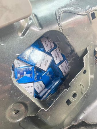 В результаті виявлено кілька тайників, з яких вийнято 2100 пачок сигарет без марок акцизного збору. Добре замасковані тютюнові вироби різних торговельних марок, обгорнуті клейкою стрічкою, були заздалегідь приховані у задніх лівому та правому крилах, задньому бампері та по всій довжині бокового порогу.