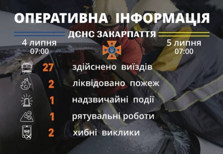 Підрозділами Головного управління ДСНС України у Закарпатській області впродовж чергової доби станом на 𝟳:𝟬𝟬 𝟓 липня для проведення заходів з попередження надзвичайних ситуацій, оперативного реагування на події та ліквідації їх наслідків, гасіння пожеж, проведення інших рятувальних заходів здійснено 𝟐𝟕 виїздів, з яких два - хибні.