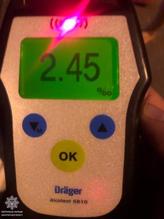Під час спілкування охоронці порядку помітили у 38-річного водія явні ознаки алкогольного сп’яніння, тому одразу запропонували пройти огляд на стан сп’яніння за допомогою драгера. Результат виявися позитивним — 2,45 проміле, а це у понад 12 разів більше допустимої норми.