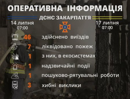 Підрозділами Головного управління ДСНС України у Закарпатській області впродовж 𝟏𝟒-𝟏𝟕 липня станом на 𝟳:𝟬𝟬 𝟏𝟕 липня для проведення заходів з попередження надзвичайних ситуацій, оперативного реагування на події та ліквідації їх наслідків, гасіння пожеж, проведення інших рятувальних заходів здійснено 𝟒𝟔 виїздів, з яких три - хибні.