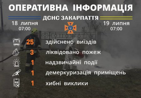 Підрозділами Головного управління ДСНС України у Закарпатській області впродовж чергової доби станом на 𝟳:𝟬𝟬 𝟏𝟗 липня для проведення заходів з попередження надзвичайних ситуацій, оперативного реагування на події та ліквідації їх наслідків, гасіння пожеж, проведення інших рятувальних заходів здійснено 𝟐𝟓 виїздів, з яких один - хибний..