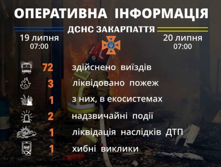 Підрозділами Головного управління ДСНС України у Закарпатській області впродовж чергової доби станом на 𝟳:𝟬𝟬 𝟐𝟎 липня для проведення заходів з попередження надзвичайних ситуацій, оперативного реагування на події та ліквідації їх наслідків, гасіння пожеж, проведення інших рятувальних заходів здійснено 𝟕𝟐 виїзди, з яких один - хибний.