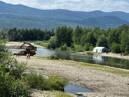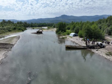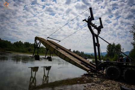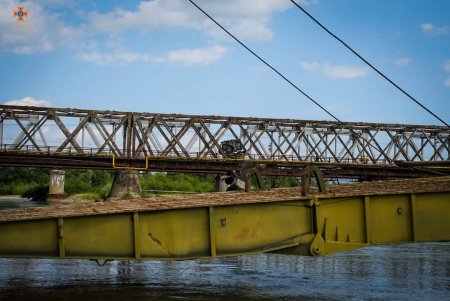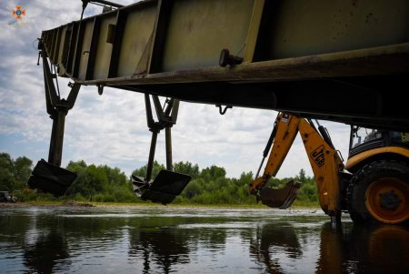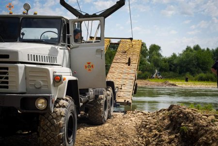 Рятувальники ДСНС встановлюють важкий механізований міст ТММ-3М1 через річку, в районі зруйнованого мосту (фото)