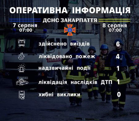 Підрозділами Головного управління ДСНС України у Закарпатській області впродовж чергової доби станом на 𝟕:𝟎𝟎 𝟖 серпня 𝟐𝟎𝟐𝟑 року для оперативного реагування на події та ліквідації їх наслідків, гасіння пожеж, проведення інших рятувальних заходів здійснено 𝟓 виїздів. Хибних викликів не зафіксовано.