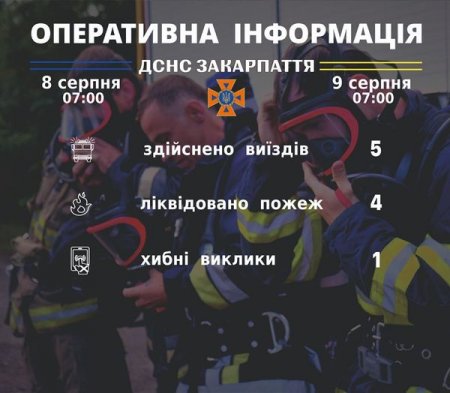 Підрозділами Головного управління ДСНС України у Закарпатській області впродовж чергової доби станом на 𝟕:𝟎𝟎 𝟏𝟎 серпня 𝟐𝟎𝟐𝟑 року для оперативного реагування на події та ліквідації їх наслідків, гасіння пожеж, проведення інших рятувальних заходів здійснено 𝟓 виїздів, з яких 𝟏 - хибний.