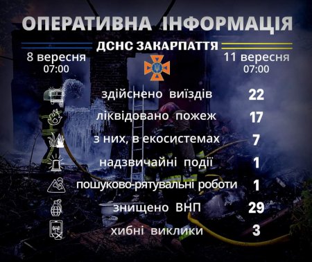 Підрозділами Головного управління ДСНС України у Закарпатській області впродовж 𝟖-𝟏𝟏 вересня для оперативного реагування на події та ліквідації їх наслідків, гасіння пожеж, проведення інших рятувальних заходів здійснено 𝟐𝟐 виїзди, з яких три – хибні.