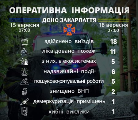 Підрозділами Головного управління ДСНС України у Закарпатській області впродовж 𝟏𝟓-𝟏𝟖 вересня для оперативного реагування на події та ліквідації їх наслідків, гасіння пожеж, проведення інших рятувальних заходів здійснено 𝟏𝟖 виїздів, з яких один – хибний.
