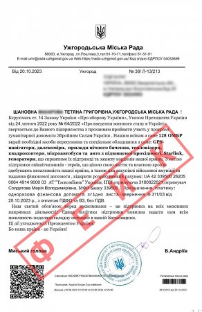 Підприємці Ужгорода повідомляють, що отримують листи, а також дзвінки від невстановлених осіб, які представляються заступниками міського голови й від імені міського голови Богдана Андріїва просять перерахувати гроші нібито для потреб ЗСУ.
