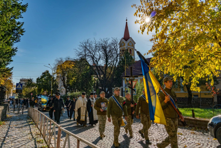 Священники відслужили заупокійну літургію, після чого скаргна хода пройшла вулицями міста до Пагорба Слави, де Андрія Авраменка поховали з військовими почестями.