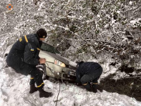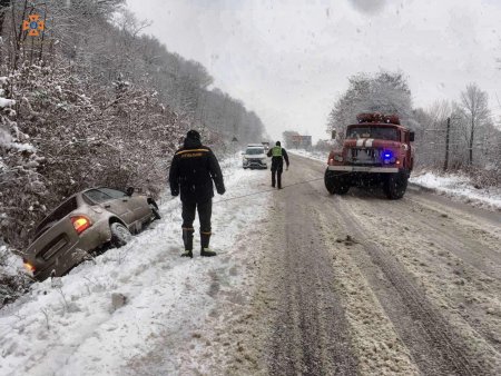 Сніговий колапс на Закарпатських дорогах: Рятувальники витягали автівку з кювету