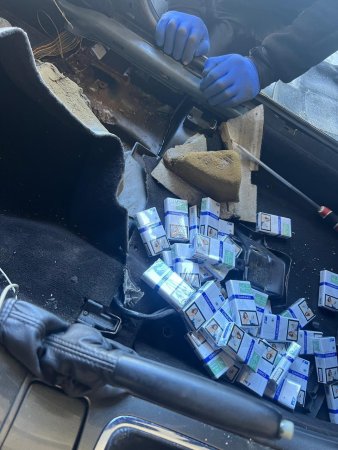 Собака миттєво винюхала «тютюновий трофей» у конструктивних порожнинах порогів автомобіля, подавши господарю спеціальний знак. Аби дістатися до тайників, митникам довелось демонтувати сидіння та декоративне покриття підлоги транспортного засобу. Цікаво, щоб дістатися до сховків, чоловік придумав для зручності виймати сигарети за допомогою прикріпленої мотузки, якою підтягувалися приховані тютюнові вироби, перемотані скотчем по кілька пачок. Загалом із автівки вийняли майже чотири сотні пачок сигарет торгової марки «Compliment Blue».