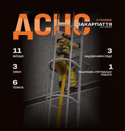 Підрозділами Головного управління ДСНС України у Закарпатській області впродовж 14-17 червня для оперативного реагування на події та ліквідації їх наслідків, гасіння пожеж, проведення інших рятувальних заходів здійснено 11 виїздів, з яких три - хибні.