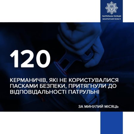 Упродовж вересня 2024-го року закарпатські патрульні винесли 1️⃣2️⃣0️⃣ постанов за їзду без пристебнутого ременя безпеки.
