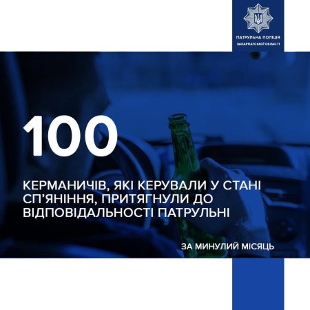 За минулий місяць патрульні поліцейські Закарпатської області притягнули до відповідальності за нетверезе керування 1️⃣0️⃣0️⃣ водіїв