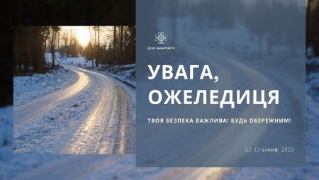22 січня, а також уночі та вранці 23 січня на більшості автошляхів Закарпатської області та в місті Ужгород очікується ожеледиця (І рівень небезпеки, жовтий).
