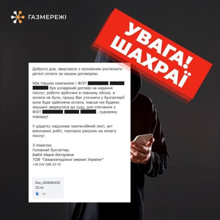 Якщо ж Ви отримали подібний лист, зверніть увагу на ім’я електронної скриньки. Дійсна електронна пошта "ГАЗМЕРЕЖІ" - office@grmu.com.ua та інші поштові скриньки із закінченням @grmu.com.ua.