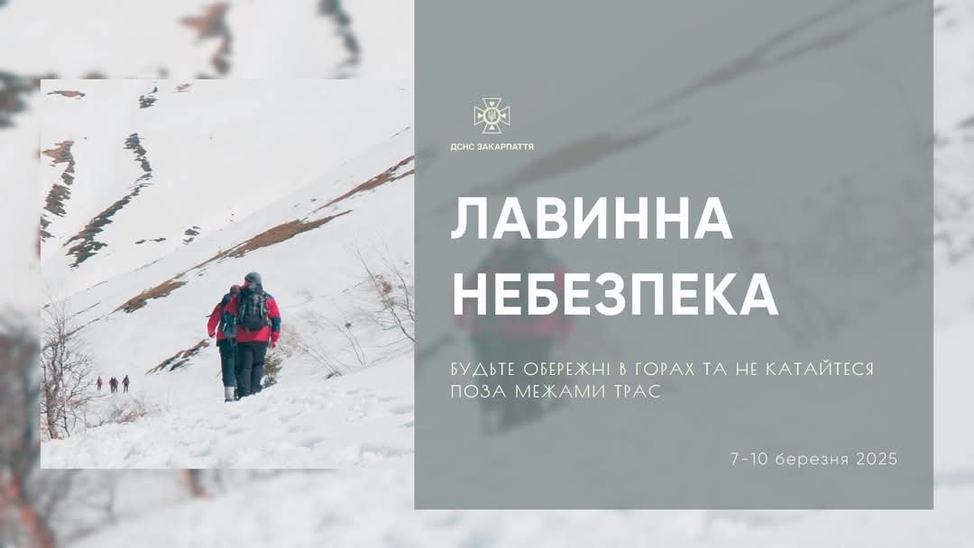 За інформацією Закарпатського центру з гідрометеорології, 7 - 10 березня, у високогір'ї східної частини Закарпатської області, у зв'язку з підвищенням температури повітря, очікується значна сніголавинна небезпека (3 рівень), на високогір'ї західної та центральної частини області - низька сніголавинна небезпека (1 рівень).