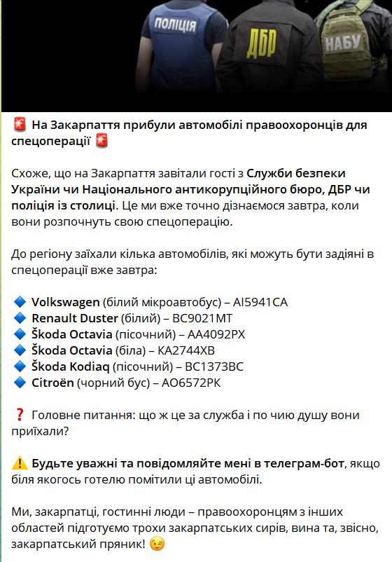 Депутат Ужгородської міської ради та відомий журналіст Віталій Глагола повідомив про прибуття до регіону правоохоронців для проведення спецоперації. За його словами, до Закарпаття завітали представники силових структур, можливо, зі Служби безпеки України (СБУ), Національного антикорупційного бюро (НАБУ), Державного бюро розслідувань (ДБР) або поліції зі столиці.