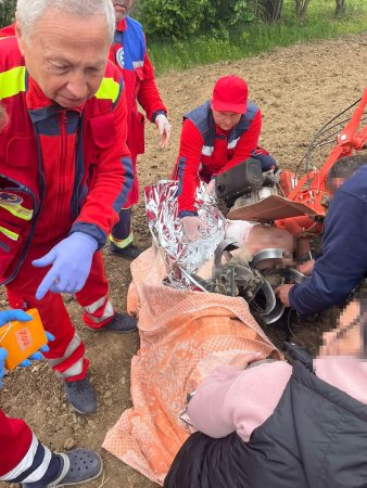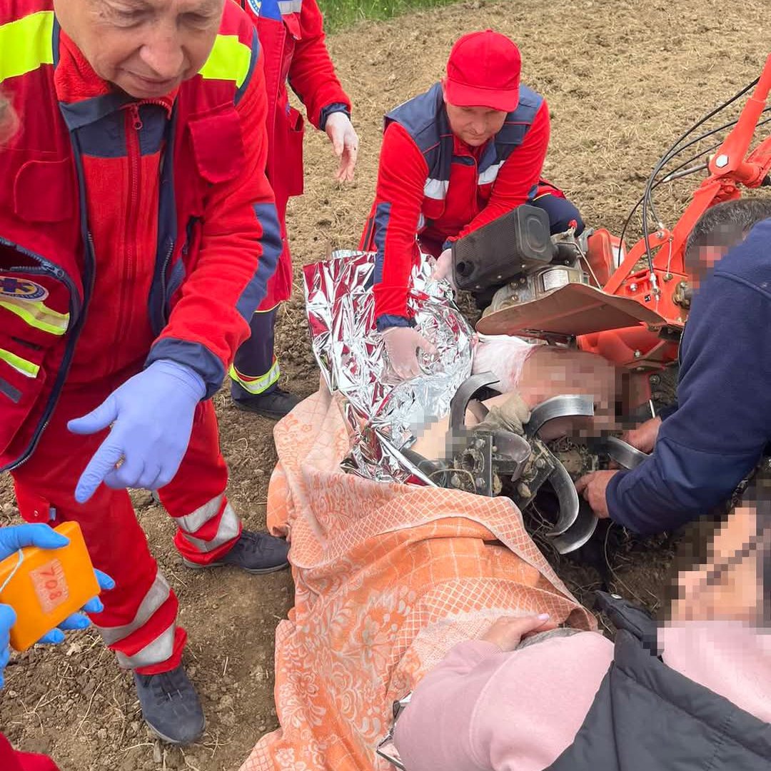 🚑 Уже за дві хвилини на місце події прибула бригада №709 — парамедик Мирослав Машіка та екстрений медичний технік Віталій Попович. Потерпілий перебував при свідомості, у стані шоку, але самостійно вибратись не міг. Його ліва рука була намотана на зуб’я фрези, а у верхню частину стегна застряг металевий елемент мотоблоку.